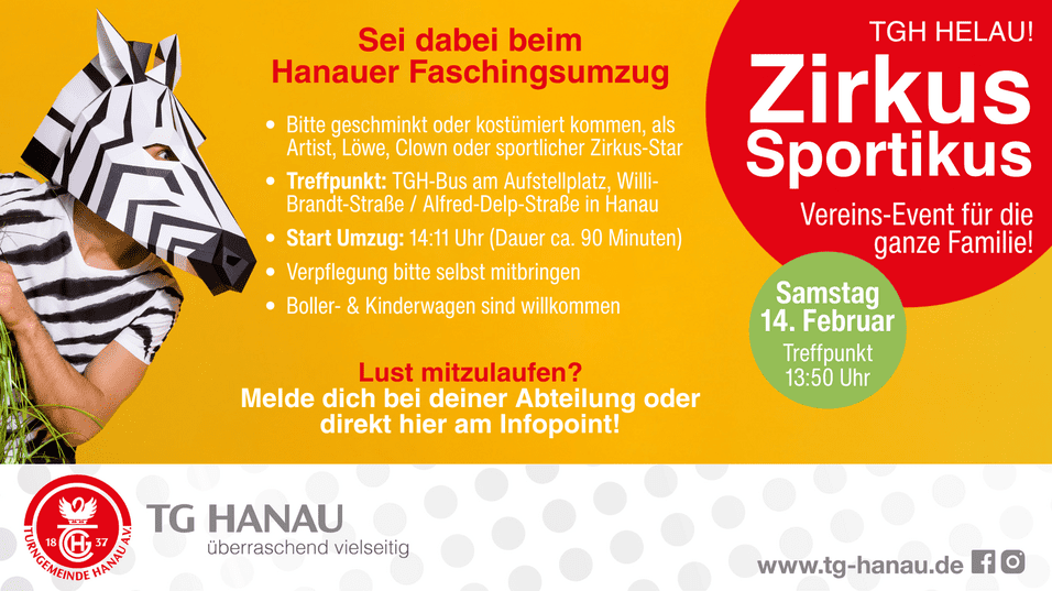Am 14. Februar 2026 ab 14:11 Uhr nehmen wir als Turngemeinde Hanau am Faschingsumzug in der Innenstadt teiln und laden Dich herzlich ein, mit der ganzen Familie dabei zu sein.