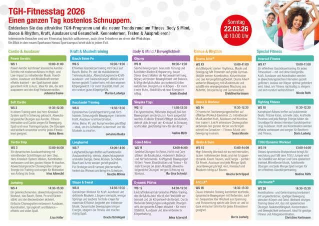 Wer am Fitnesstag TGH-Mitglied wird, spart 19 Euro Aufnahmegebühr! Hört sich gut an? Dann komm nach deinem Workshop einfach zu einem Mitarbeiter an unseren Info-Stand.