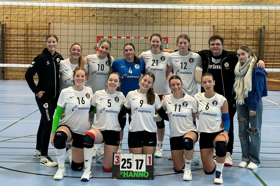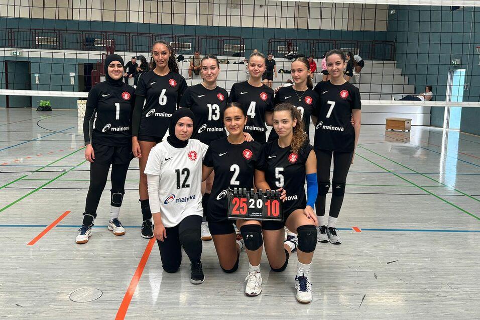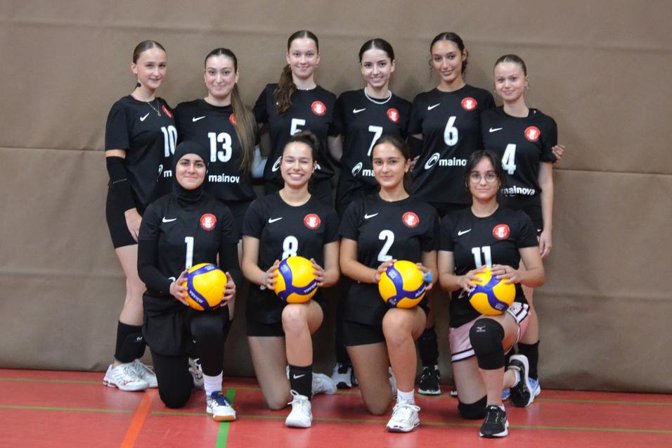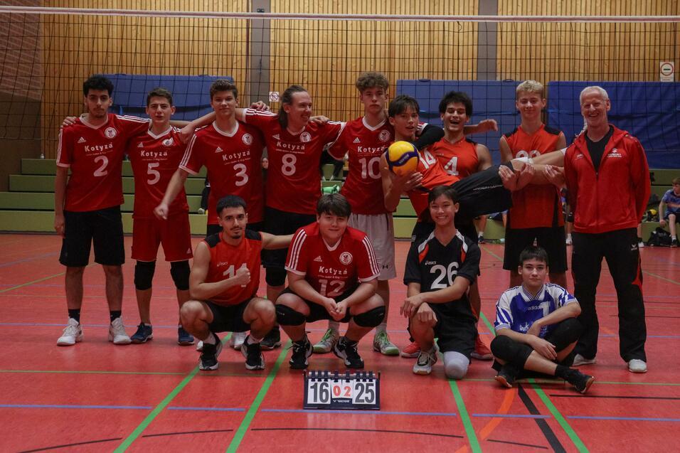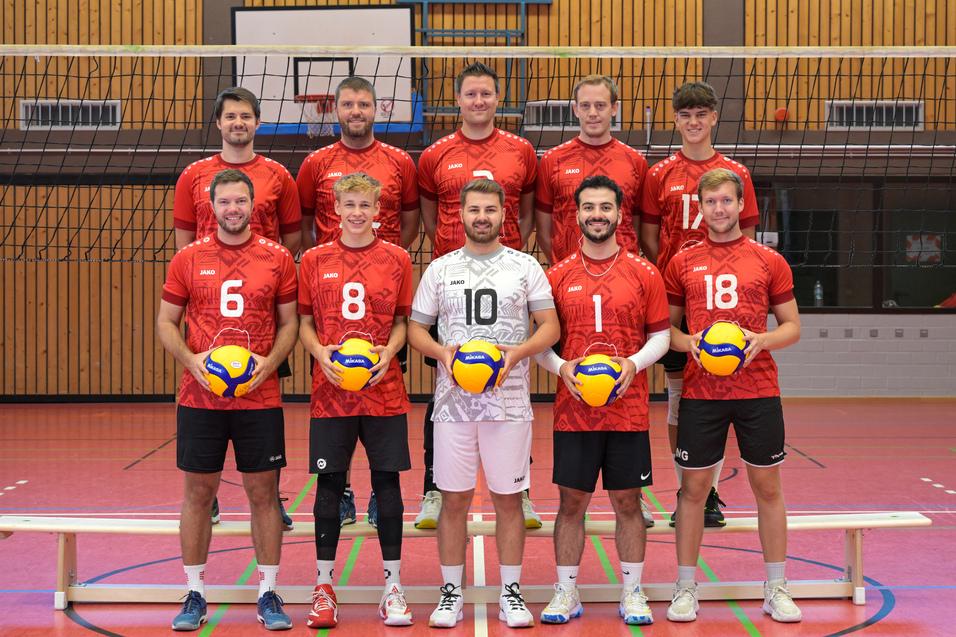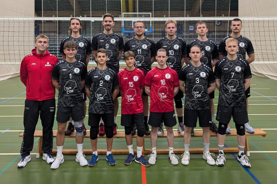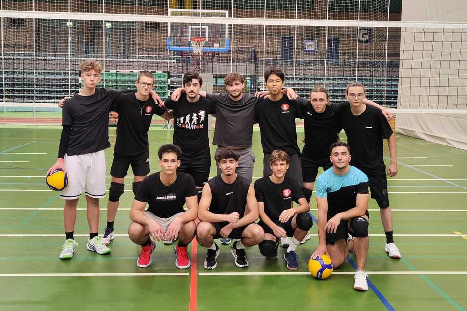 Unscharfe Silhouetten von zwei Personen hinter einem Volleyballnetz in einer Sporthalle. Eine Person hält einen Volleyball.